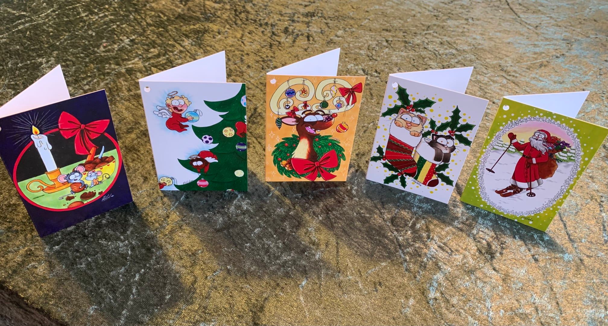 - 10 pk julekort: Fem motiver i A7-format (7,4 x 10,5 cm). Pris: 110 kroner (30 kroner går til Plan).